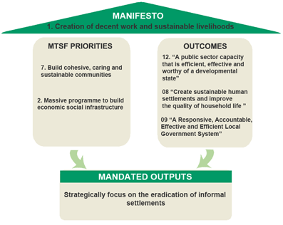 CoGHSTA operates within the government-wide outcomes-based model, which is derived from the five-year manifesto of the ruling party, the African National Congress; subsequently the Medium-Term Strategic Framework of the South African government.